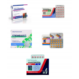 Состав курса: Тестостерон Энантат (6 ампул), Данабол (100таб), Станозолол (60таб), Анастразол (20таб), Кломид (40таб)