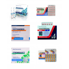 Состав курса: Метандиенон (100 табл), Сустанон (12 ампул), Дека (6 ампул), Анастрозол (20 табл), Станазолол (60 табл) и Кломид (60 табл)